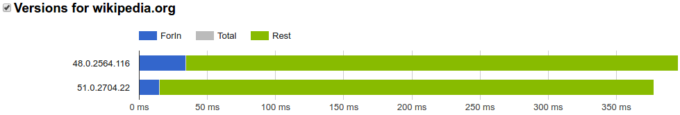 Many popular websites rely heavily on for-in and benefit from its optimization. For example, in early 2016 Facebook spent roughly 7% of its total JavaScript time during startup in the implementation of for-in itself. On Wikipedia this number was even higher at around 8%. By improving the performance of certain slow cases, Chrome 51 significantly improved the performance on these two websites: